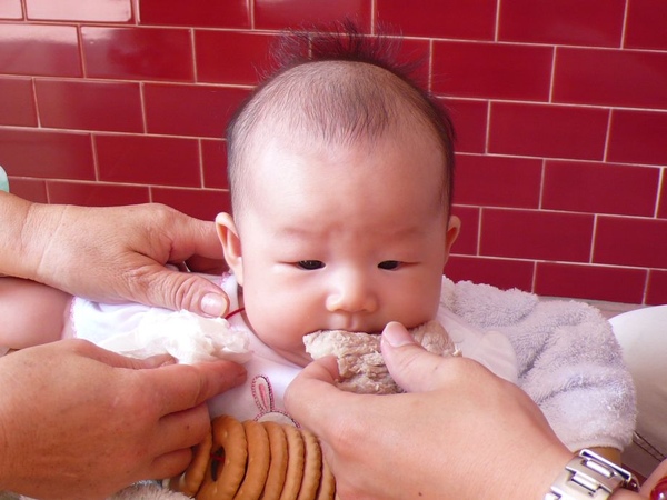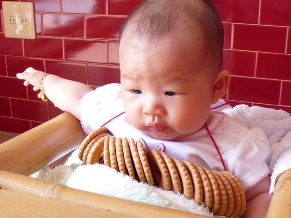 綁上去後,媽媽拿下2塊餅乾,在妤寶寶的嘴邊擦一擦,